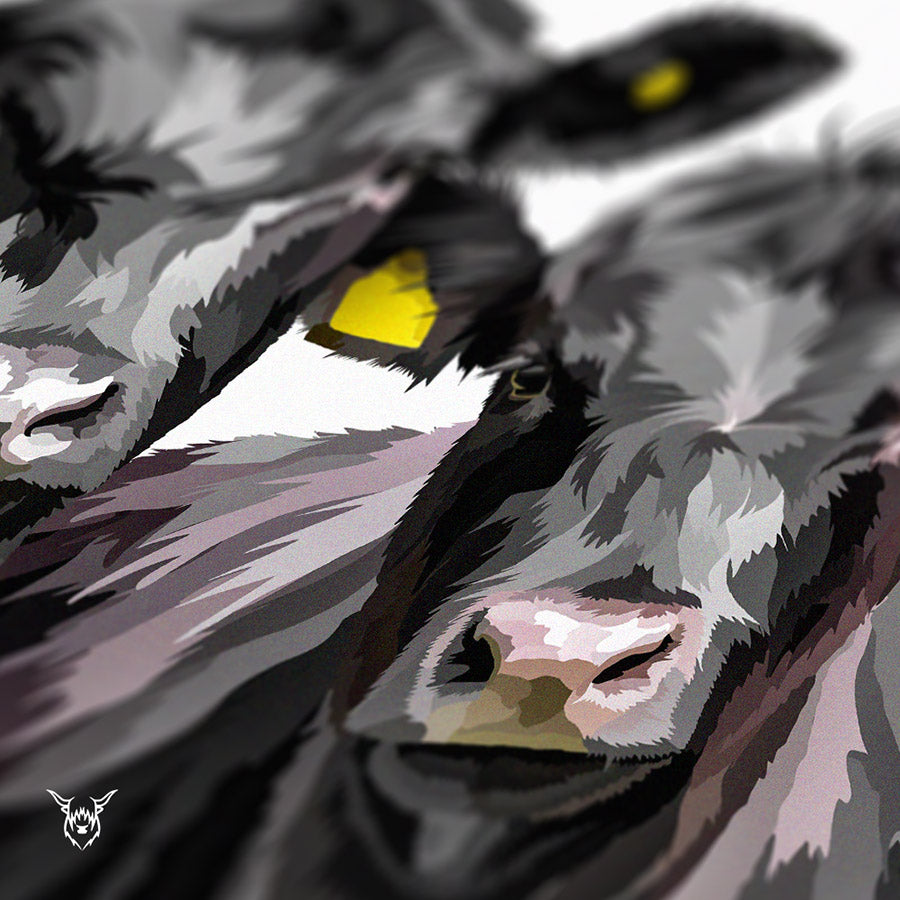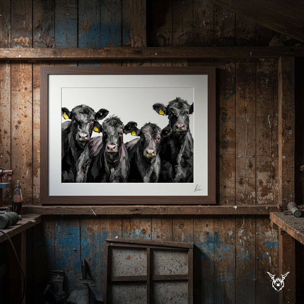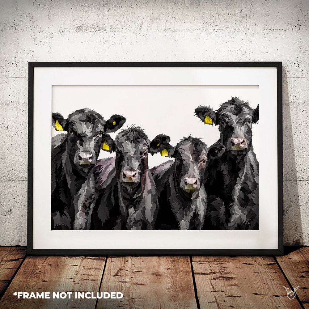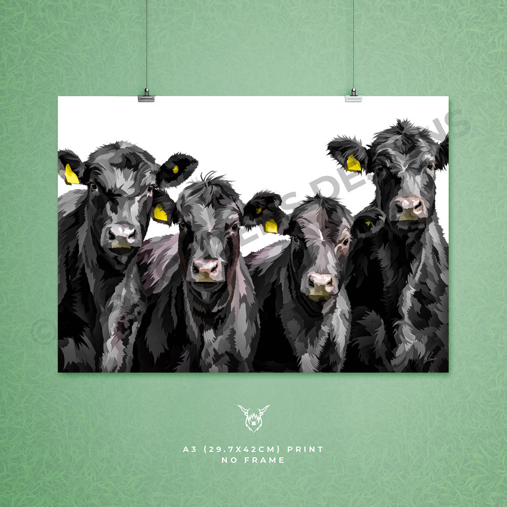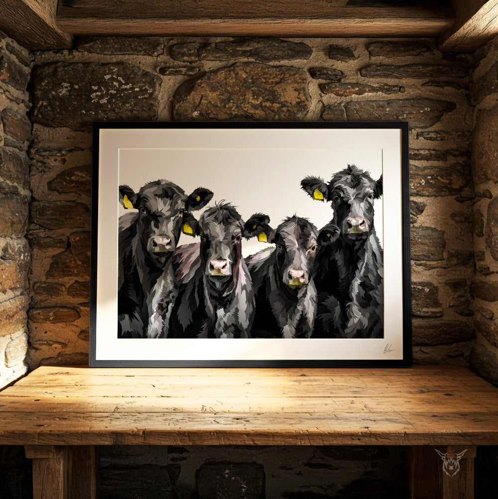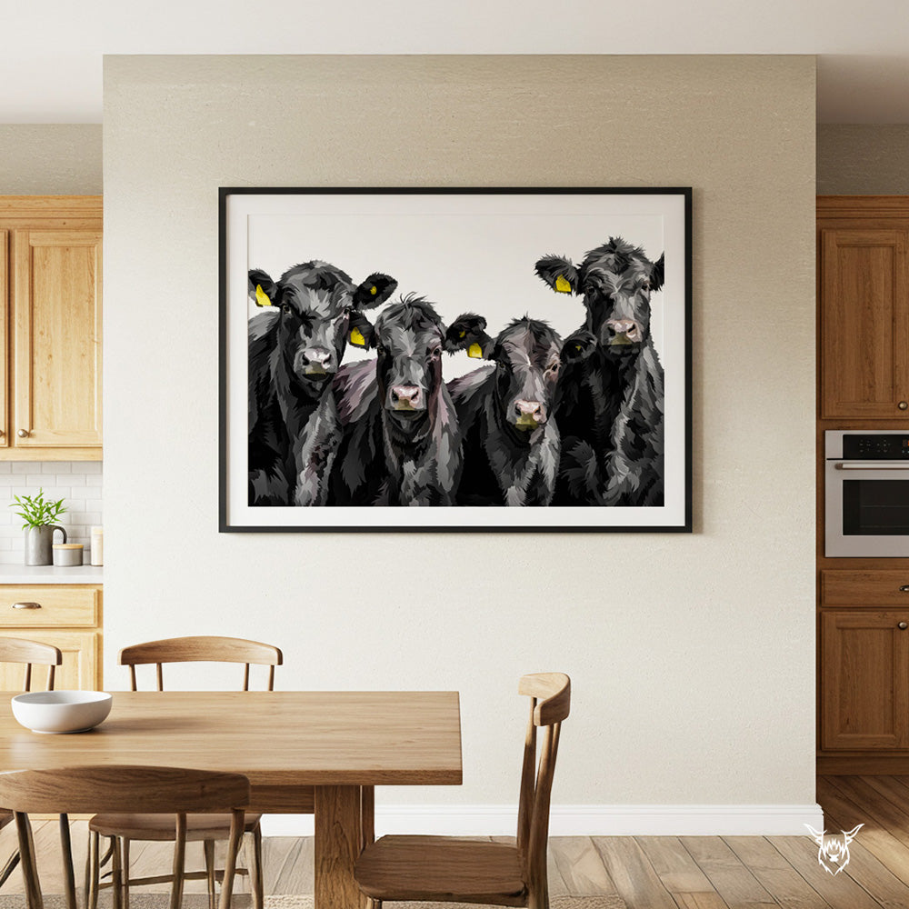 A modern art print of Aberdeen Angus Cattle.