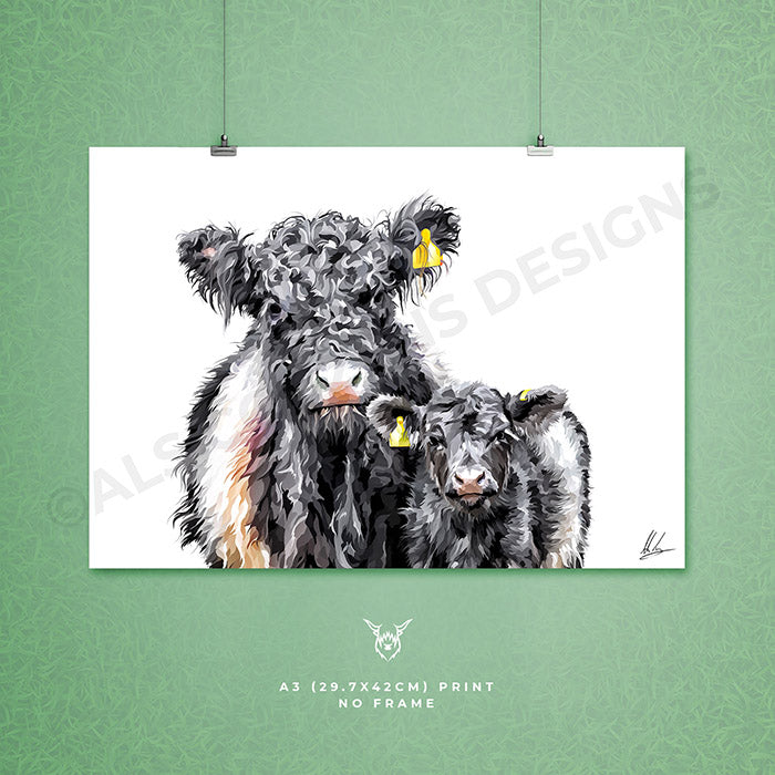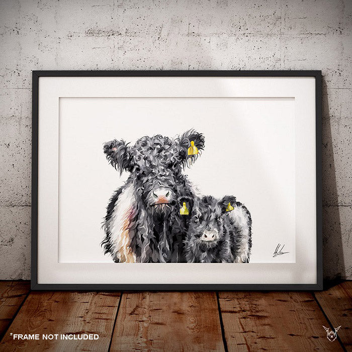 A modern art print of a Belted Galloway Cow and Calf.
