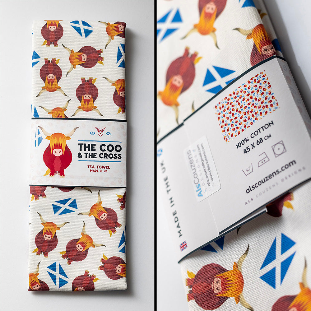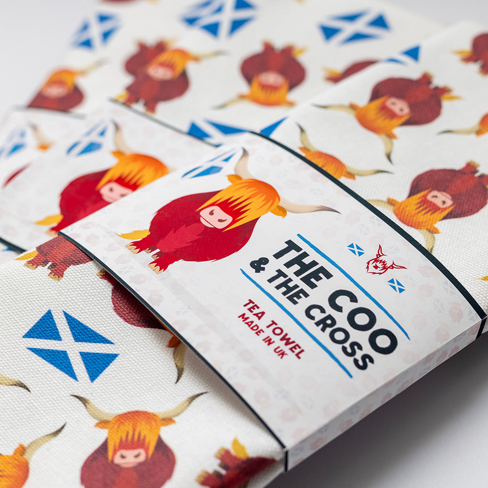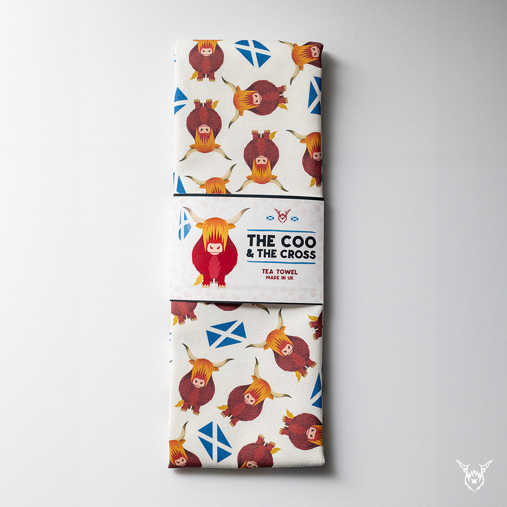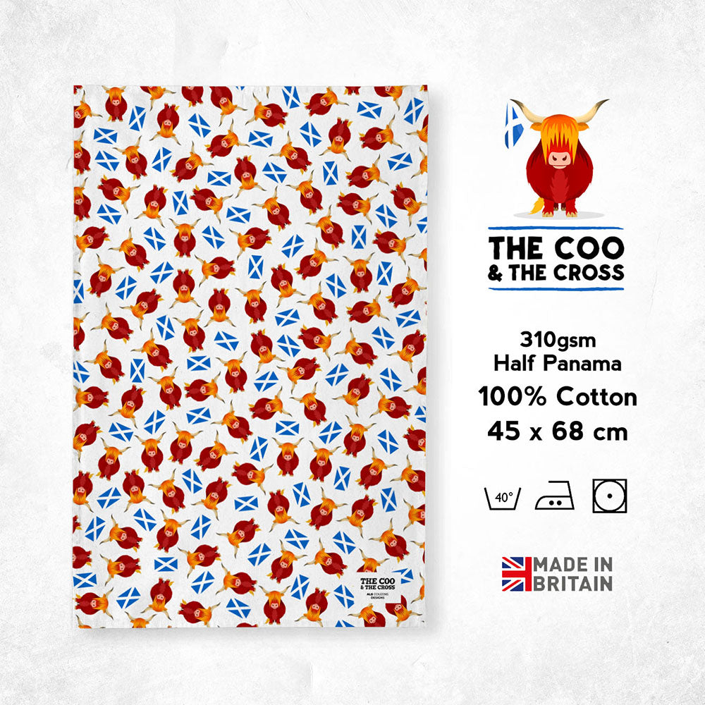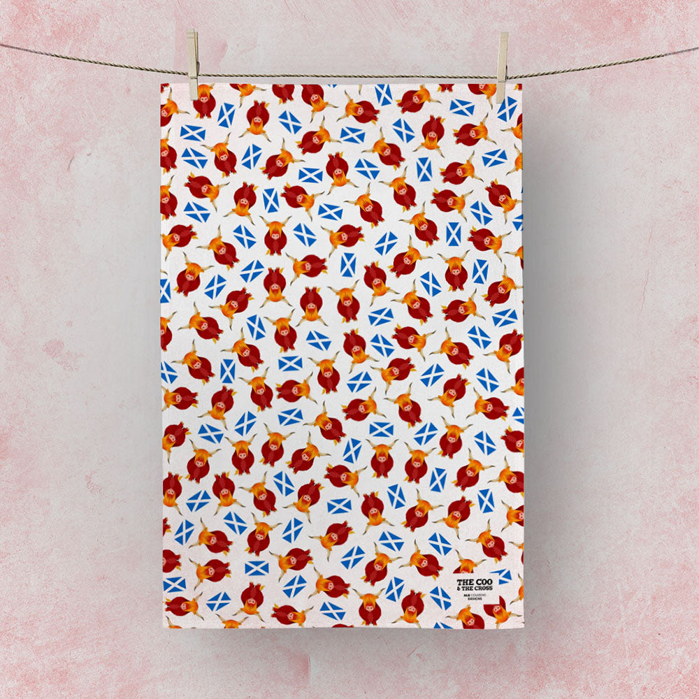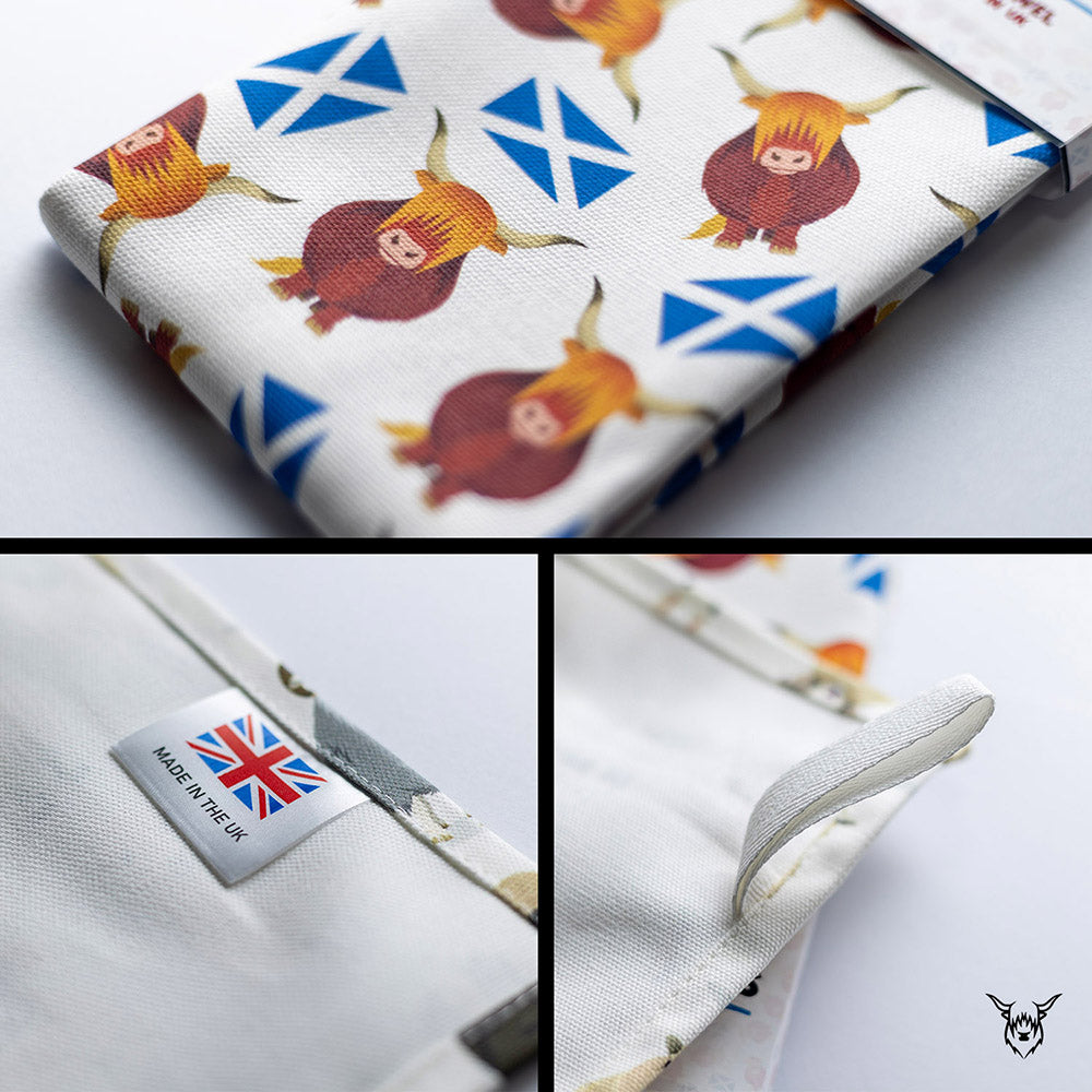 A fun and colourful tea towel with highland cows and the saltire!