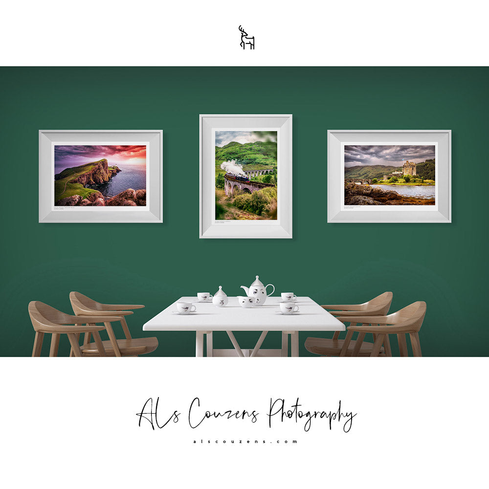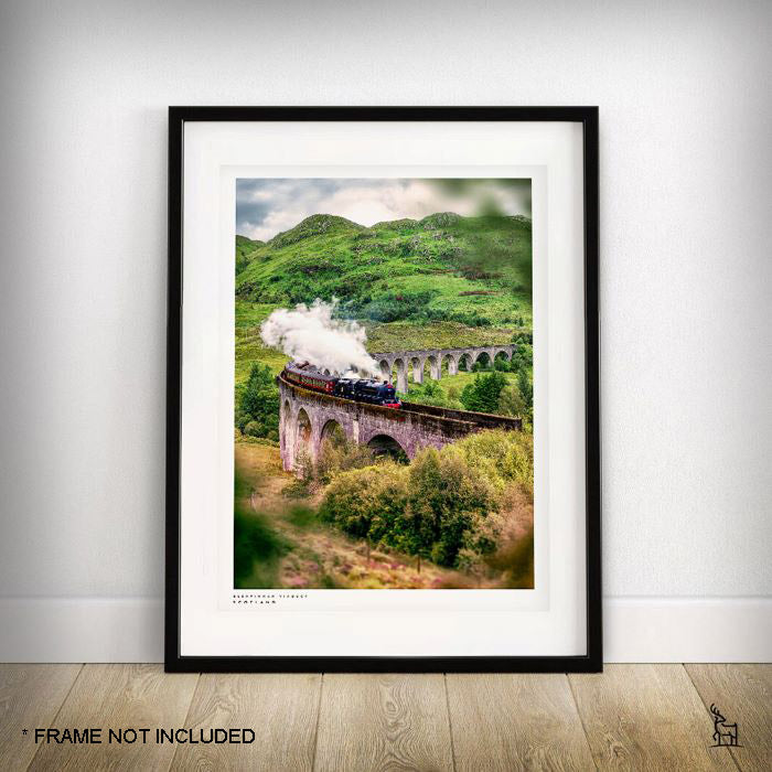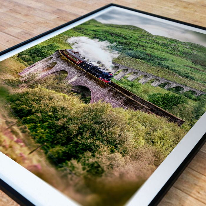 A beautiful photography print of the iconic Jacobite Steam Train crossing the Glenfinnan Viaduct in the Scottish Highlands.