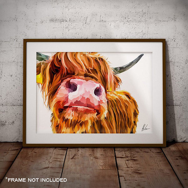 A modern and fun art print of a nosey Highland Cow.