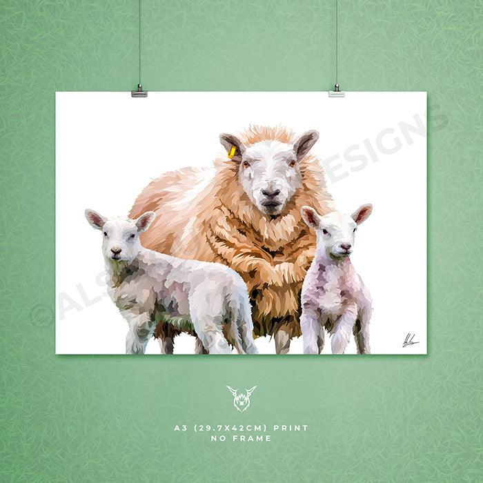 A modern art print of a Texel cross Cheviot Ewe with Lambs.