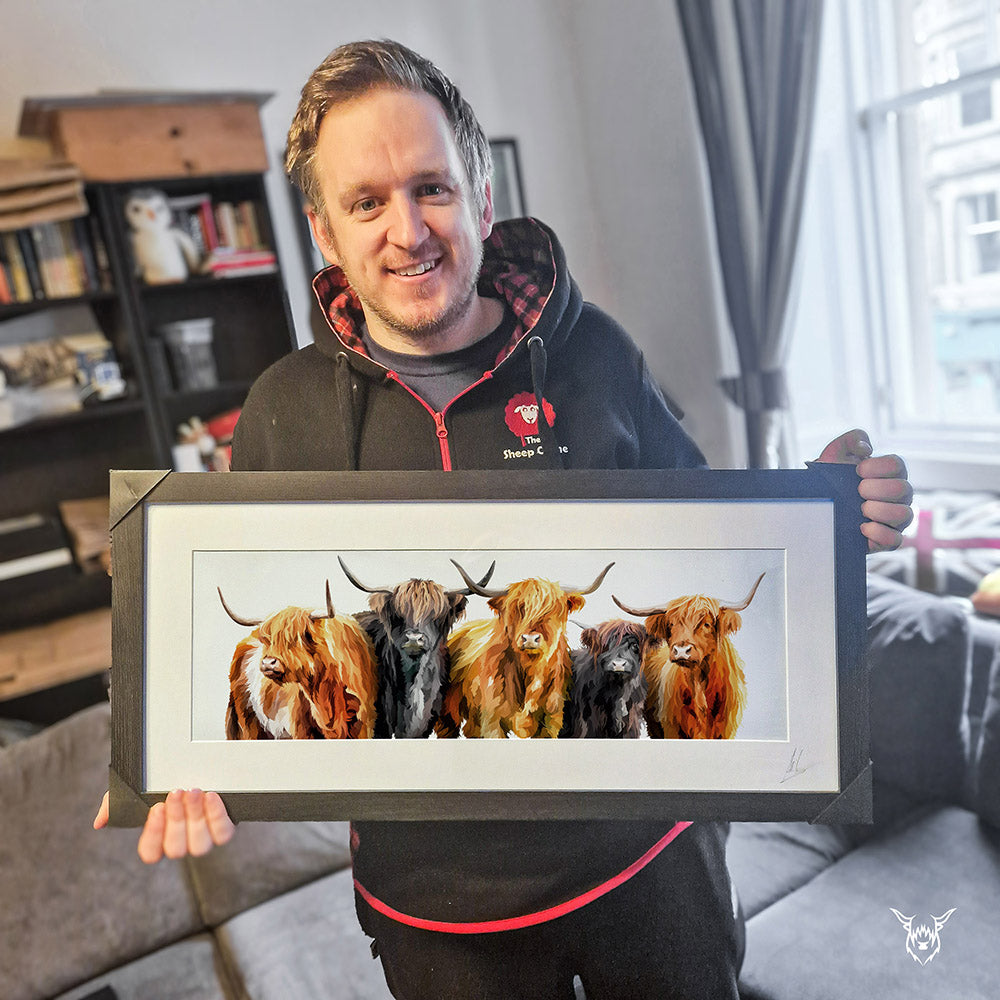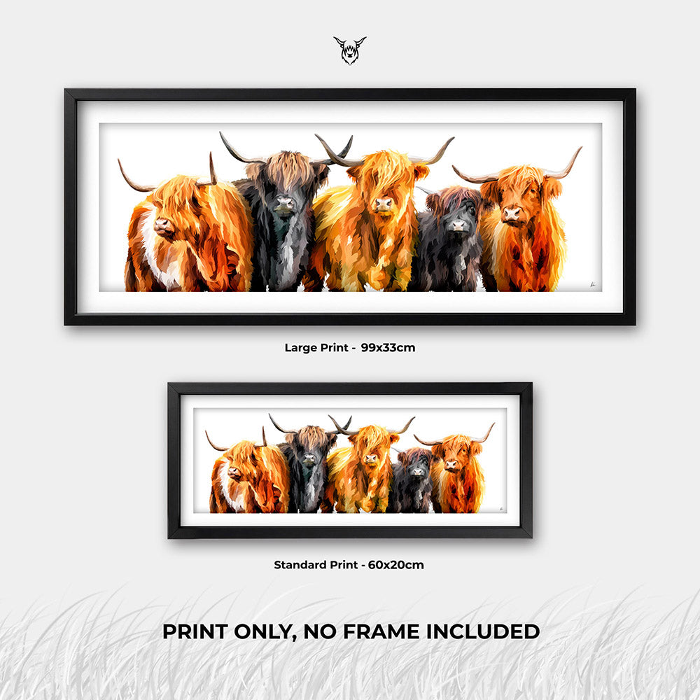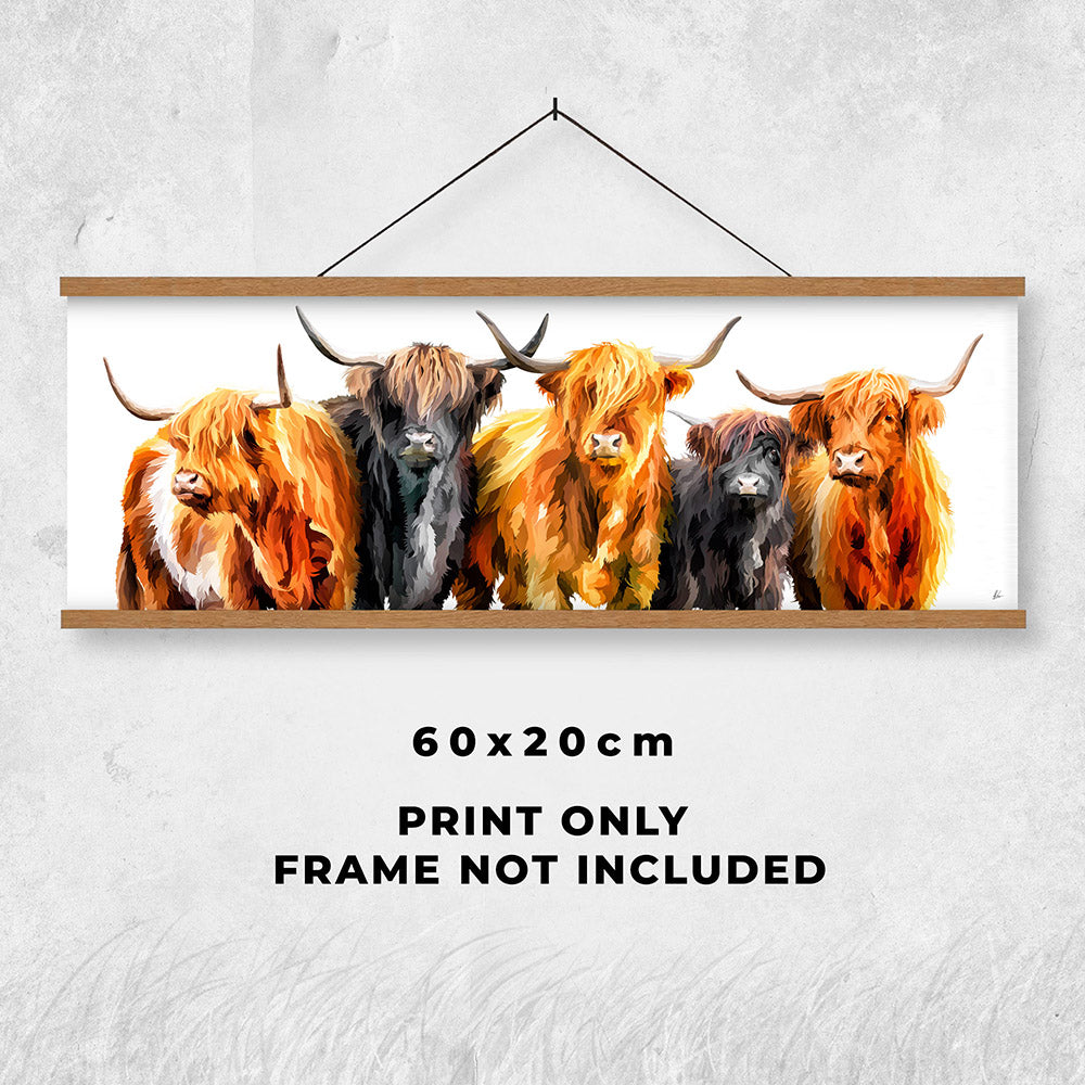 A modern art print of five beautiful Scottish Highland Cows.