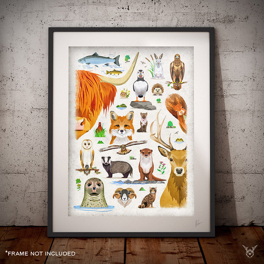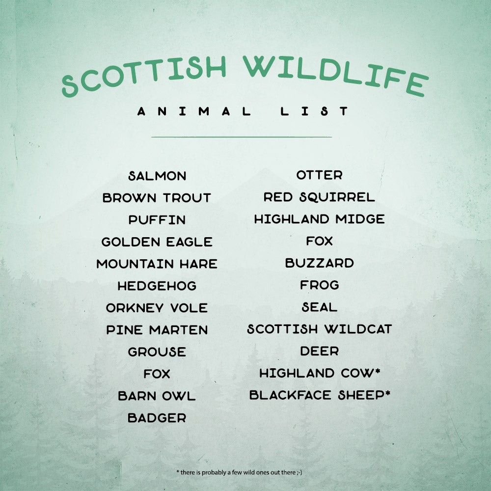 Animals include - Red Deer, Badger, Barn Owl, Fox, Red Squirrel, Golden Eagle, Mountain Hare, Hedgehog, Otter, Orkney Vole, Scottish Wild Cat, Puffin, Pine Martin, Blackface Sheep, Highland Cow, Salmon, Trout, Red Grouse, Buzzard, Frog and a wee Midgie hidden in their too!